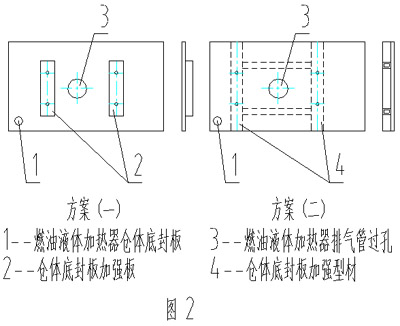 3.1 燃油液体加热器的安装 燃油液体加热器通常是在车辆的仓体里安装,因而燃油液体加热器仓体底封板强度必须牢固可靠,通常采用在燃油液体加热器仓体底封板上加焊5.0mm厚的钢板或采用加焊加强型材,结构如图2所示。具体采用哪种方案根据实际仓体布置的需要,方案(二)比方案(一)强度更好,但结构相对比较复杂。