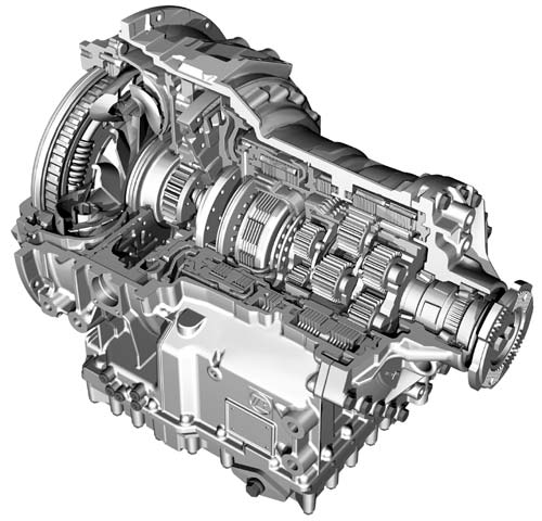 1)变矩器:液力变矩器是一种带闭锁离合器的无磨损起步装置,包括涡轮,泵轮和导轮,仅在车辆起步阶段工作,之后会自动闭锁。在起步阶段以后,变速器内的闭锁离合器将发动机动力刚性传递到行星齿轮组,从而消除变矩器工作时的动力损耗。