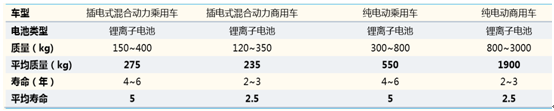 根据公路部门统计,轿车、轻型车年平均行驶里程为5万km、中型车位4万km、重型车为3万km;在同样的行驶条件下,纯电动乘用车动力电池的使用寿命约为4-6年;而纯电动商用车日行驶次数多、行驶里程长、充电较为频繁,其动力电池的使用寿命约为2-3年。目前我国私人乘用车平均报废年限在12-15年,商用车强制报废年限为10年,电动汽车在其寿命周期内至少更换2次动力电池,而且由于不确定性因素(意外事故、人为原因等),动力电池的寿命周期会不断变化。