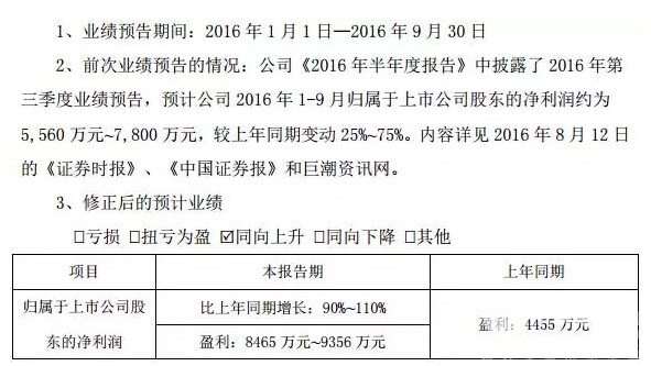 此前,成飞集成在《2016年半年度报告》中披露了2016年第三季度业绩预告,预计公司 2016年1-9月归属于上市公司股东的净利润约为5,560万元~7,800万元,较上年同期变动25%~75%。