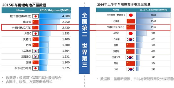 目前,宁德时代在全国有三大生产基地,分布在宁德、青海、溧阳,占地3500亩;中德两大研发中心,超过1万名员工,逾1000名高端科研人员;专利申请2000多项,拥有动力电池制造核心技术;售后服务网点将近300家,分布在全国127个城市,可实现“1小时响应+300公里覆盖+5星级标准服务+100%回访”。2015年全球车用锂电池产量和2016年上半年车用锂电池出货量,宁德时代都位列第三,是国内惟一一家有能力参与国际竞争的动力锂电池生产企业。