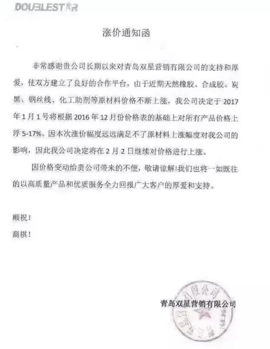 由于近期天然橡胶、合成胶、炭黑等原材料价格不断上涨,公司决定于2017年1月1日将根据2016年12月份价格表的基础上对所有产品价格上浮5-17%。并且决定在2月2日继续对价格进行上涨。