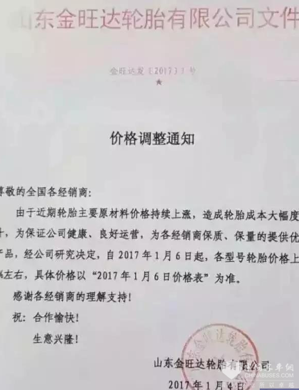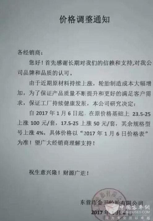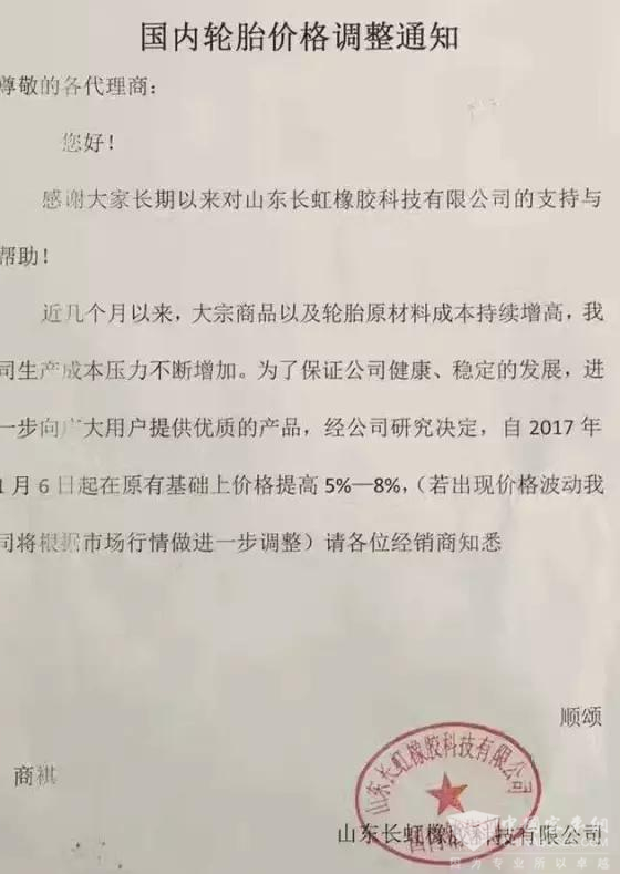 近几个月以来,大宗产品以及轮胎原材料成本持续增高,公司决定自2017年1月6日起在原有基础上价格提高5%-8%。