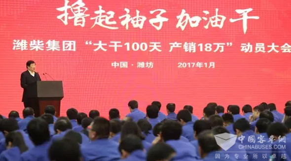 潍柴董事长谭旭光:“我们召开‘大干100天 产销18万’动员大会,目的就是给大家加油鼓劲,全力以赴夺高产、保订单,努力满足市场客户需求,抓住机遇实现更好更快发展。”