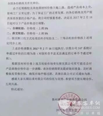2017年2月16日起,贵州前进轮胎销售有限公司全钢轮胎、斜交轮胎价格统一上调5%。