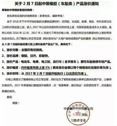 2017年2月7日起,中策橡胶第三轮上调车胎类产品出厂价。