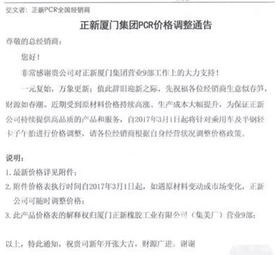 近日,正新厦门集团营业9部发布轮胎价格调整通知。