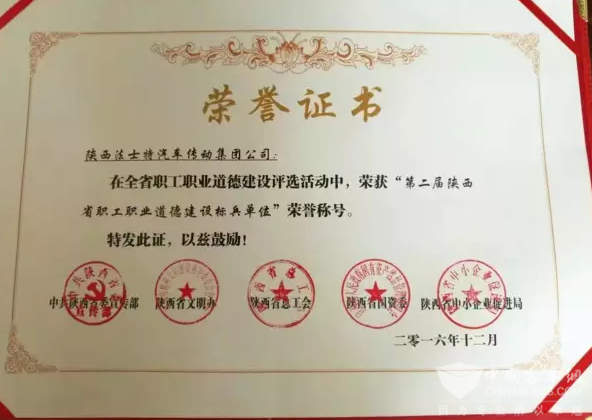 2017年2月17日消息,日前,中共陕西省委宣传部、陕西省文明办、陕西省总工会、陕西省国资委、陕西省中小企业促进局等五部门共同组织开展了第二届全省职工职业道德建设评选活动,并对获奖单位和个人进行表彰。法士特集团凭借职工职业道德建设取得的优异成果,喜获“第二届陕西省职工职业道德建设”标兵单位荣誉称号。
