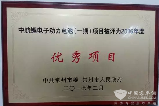 2017年2月22日消息,2016年度常州市优秀项目奖日前揭晓。中航锂离子动力电池(一期)项目榜上有名。这是继中航锂电(江苏)有限公司荣获常州市金坛区“工业投入领先奖”后,又收获常州市“优秀项目”奖,成为金坛区唯一获此殊荣的企业。