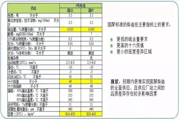 国IV和国III柴油各项指标对比可以看出,国IV要求更低的硫含量以及更高的十六烷值,从而达到国IV排放降低污染物排放的要求。