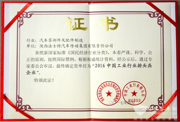 法士特集团 获2016中国工业行业排头兵企业证书