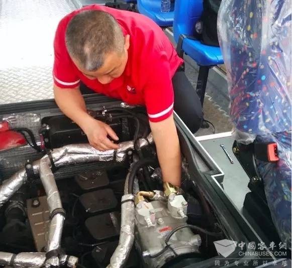 服务人员与成排的宇通客车“他乡遇故知”
