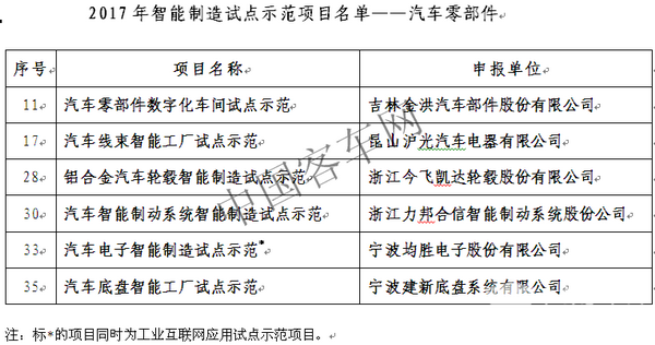2017年9月15日—24日,按照《智能制造发展规划(2016-2020年)》《智能制造工程实施指南(2016-2020年)》的要求,工信部公示了“2017年智能制造试点示范项目”,列示项目98个,其中,其中涉及汽车产业的18项。