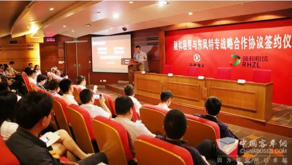 精进电动董事长兼CEO余平、中电投融和租赁总经理蔡宁、东风特专总经理李保才、宁德时代销售总监王静竹出席会议并完成签约仪式。