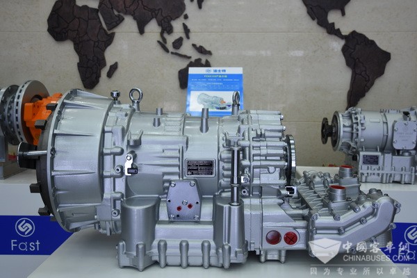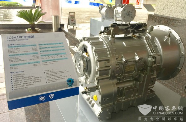 其中,FC6A系列液力自动变速器产品具有模块化的设计特点,可以在基本型的基础上进行组合,可实现基本型、带取力器接口型、带缓速器型、带缓速器和取力器接口型等多型号产品,根据用户的特殊需求,进行模块化的组合。该产品具备多项优于竞争对手的技术优点,外置式离合器控制电磁阀和油滤器的设计,同时提供了“动力模式”和“经济模式”供驾驶员自行选择,不仅安全性高、养护方便、操作舒适,而且其配备高效变矩器和优化的换挡策略可以为客户节省6%—8%燃油费用。