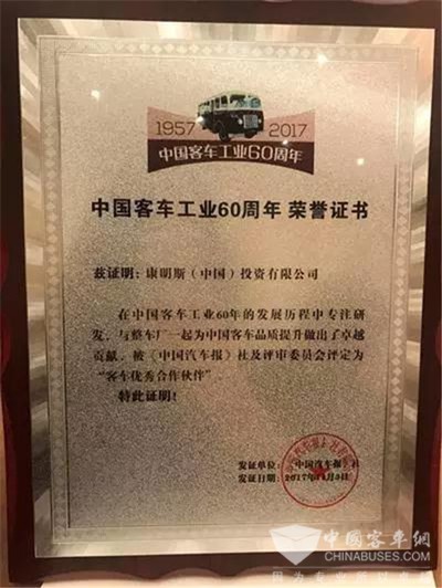 康明斯荣获“中国客车业60周年优秀伙伴奖”