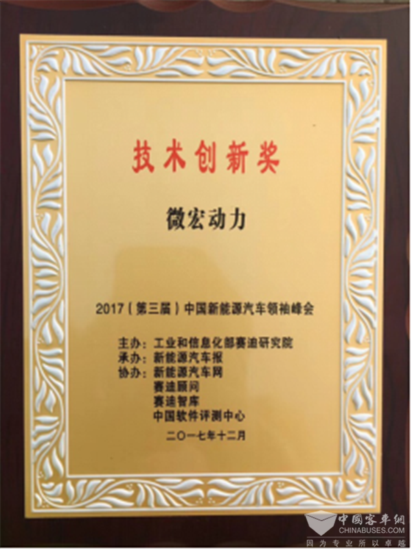 微宏荣获“2017年(第三届)中国新能源汽车领袖峰会技术创新奖”