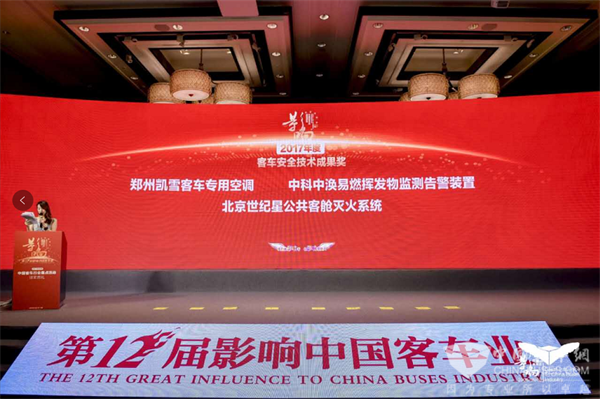 当天日下午18时:“第十二届影响中国客车业年度盘点活动”结果揭晓并举行隆重的颁奖典礼。由专家评定、客户投票、网络评议,经过激烈的角逐,凯雪空调荣获“影响中国客车业2017年度中国客车行业-安全技术成果奖”。