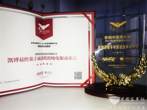 活动当晚,“第十二届影响中国客车业年度盘点活动”调查评选结果正式揭晓。通过组委会及评审委员会的严格选拔,凭借其2017年产品美誉度,苏州凯博易控驱动技术有限公司(简称凯博易控)实力亮剑。旗下“基于减速箱的纯电驱动系统”的产品先进性、安全性、高可靠性等优势及2017年优异市场表现,获得“新能源客车电驱动技术成果奖”殊荣。作为商用车领域的“新兵”,凯博易控获得此殊荣,这既是对其产品的充分肯定,更是鞭策其阔步前行的力量。