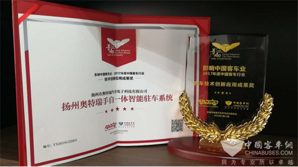 当天举行的“第十二届影响中国客车业年度盘点活动”结果揭晓并举行隆重的颁奖典礼。由专家评定、客户投票、网络评议,经过激烈的角逐,扬州市奥特瑞汽车电子科技有限公司的“手自一体智能驻车系统”荣获“2017年度中国客车行业·技术创新应用成果奖”