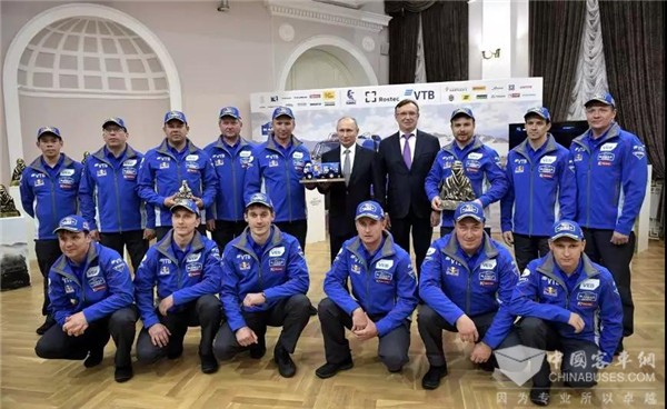 自2000年至2017年的16届达喀尔拉力赛卡车组赛事中,带走了15座冠军奖杯的传奇车队KAMAZ-Master车队,这一次自然也没有空手而归——在2018年1月20日刚结束的本届“转战南美后最艰难,退赛率最高”的达喀尔拉力赛中,来自俄罗斯的王者再次摘得了桂冠。而他们最知名的粉丝——俄罗斯总统普京先生,也早已为这些凯旋的英雄们准备好了接风宴,亲自向他们表示祝贺!唯一的不同,则是此次的军功章里,有了东风康明斯的那一份。