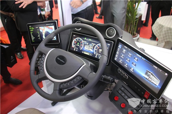 董社森介绍,不可阻挡的信息化发展,带来网络架构复杂度、驾驶区布局复杂度不断增加,以往两路CAN总线的网络架构已无法满足如今的智能化车辆需求。森鹏“悬浮屏”全数字驾驶舱采用6路CAN总线一体式网络架构,搭载悬浮式全液晶仪表、中控屏、调度屏,全车信息化一体式整合方案,最重要的开关全都触手可及。采用可编程CAN总线数字开关面板,中控屏可扩展不少于64个虚拟按键,灵活的配置选择,模块化供货,实现了功能、便捷、美观的平衡。