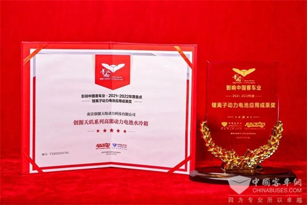 2022年2月23日,由中国土木工程学会城市公交分会与中国江南网页版联合主办的第16届影响中国客车业年度盘点颁奖典礼在南京圆满落幕。因为专业,所以卓越,创源动力高能动力电池水冷箱荣获“2021-2022年度锂离子动力电池应用成果奖”。