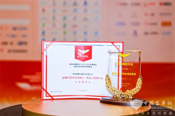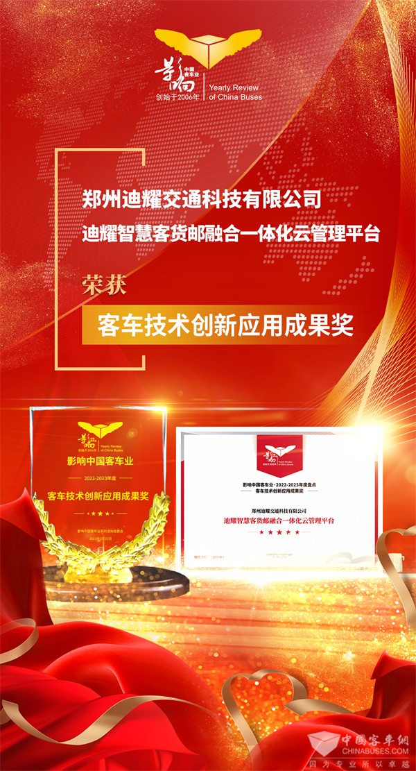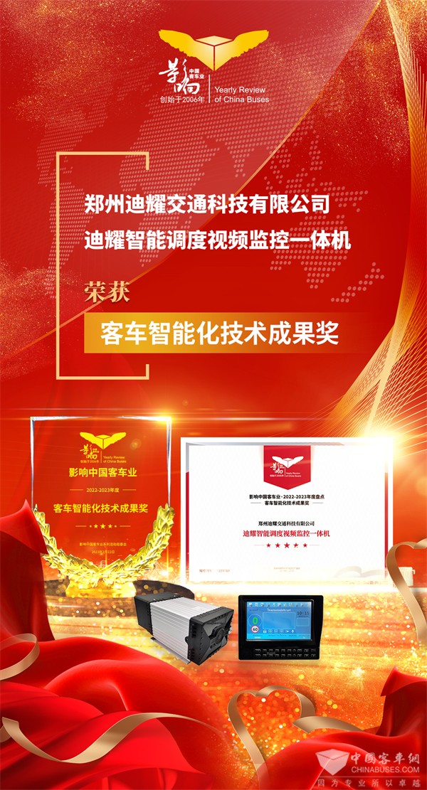 2023年2月22日,第17届影响客车业年度盘点颁奖典礼在南京举行。智慧交通领域的杰出代表郑州迪耀交通科技有限公司成功荣获2022-2023年度“客车智能化技术成果奖”和“客车技术创新应用成果奖”两项大奖,用科技点亮智慧客车最亮的“星”。