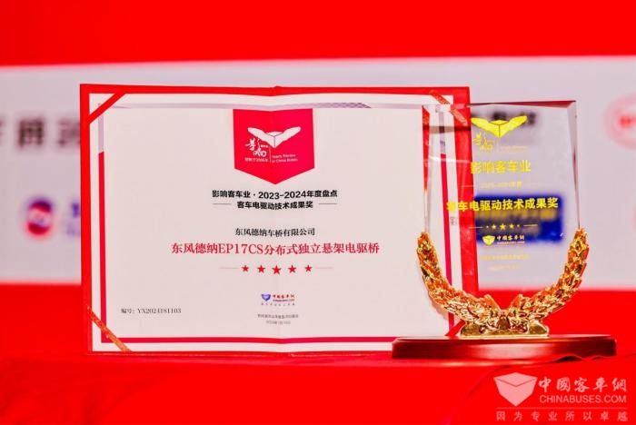 经过组委会专业评审团的严格筛选与评定,本届影响客车业年度奖项名单正式揭晓,东风德纳EP17CS分布式独立悬架电驱桥凭借轻量化、功率密度、整车能耗、扩展性能、大通道、高舒适性、低维护成本等优势,荣获客车业电驱动技术成果奖,这也是东风德纳连续四年获得“影响客车业”大奖。