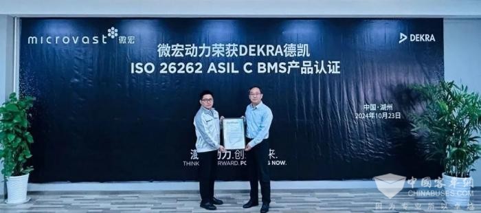 2024年10月23日,微宏动力第五代BMS产品获得了国际独立第三方检测、检验和认证机构DEKRA德凯颁发的ISO 26262 ASIL C功能安全产品认证证书。这一认证证书的获得标志着微宏动力的电池管理系统(BMS)在安全性与可靠性方面开启了全新篇章,进一步展示了其在动力电池领域的产品力和竞争力。颁证仪式于湖州微宏动力公司举行,微宏动力产品研究院院长肖宁强以及DEKRA德凯中国功能安全技术经理刘杰等共同出席。