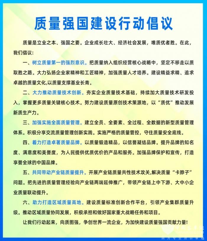 2024年11月11日,由国家市场监督管理总局主办,以“质量强企•共创未来”为主题的全国质量强企经验交流现场推进会在北京举行。潍柴作为国家市场监督管理总局首批评选的34家“质量强国建设领军企业”代表,现场签署质量强国建设行动倡议书。