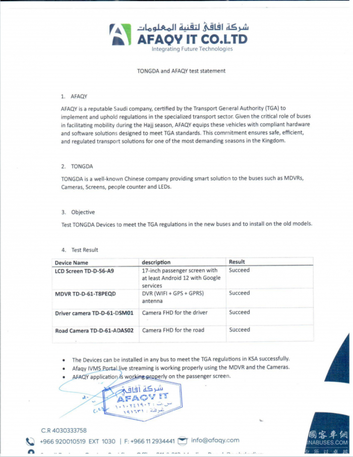 经过前期充分的应用和验证,通达电气为沙特阿拉伯Afaqy配备的多款硬件设备和软件解决方案通过TGA标准认证,产品获准适用于沙特阿拉伯国家朝觐车,提供安全、高效和规范的交通运输解决方案。