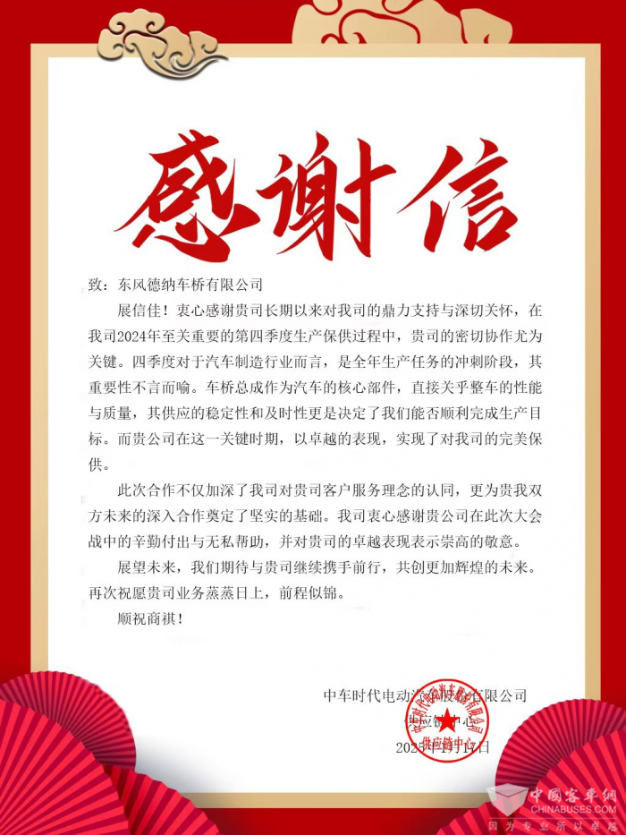 新年伊始,中车时代电动汽车股份有限公司(以下简称中车电动)向东风德纳车桥有限公司发来感谢信,感谢其在2024年度四季度生产保供过程中的卓越表现。