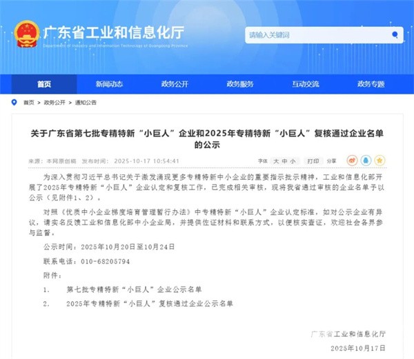 据江南网页版获悉2025年10月27日,广东省工业和信息化厅发布2025年专精特新“小巨人”企业名单,通达电气凭借卓越的创新能力、领先的技术实力与强劲的市场竞争力,成功入选国家级专精特新“小巨人”企业。