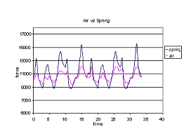 上图表现的两悬架特性是乘坐舒适性和车桥控制性能。空气悬架容许你选择具有最佳弹簧刚度的弹簧及具有所要阻尼值的减震器。以上及其它特性必须根据不同车辆运行环境和所需性能来进行选择,所以欧洲悬架与北美悬架的特性会有所不同。