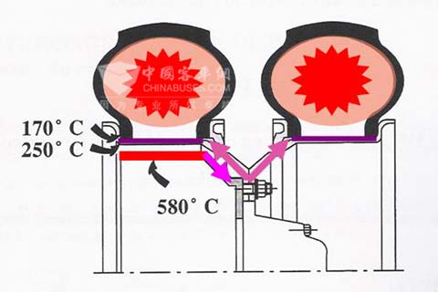 以一辆19吨卡车为例,当它以65Km/h的速度6%的下坡行驶180秒,其闸毂间温度可达580 ºC。而这些热能的80%将以热传导的方式向轮毂传递,15%由热对流扩散,5%由热辐射散发。 由于轮胎内体积基本不变,轮胎内气压由3巴增加到6巴时,其温度由100 ºC剧升到450 ºC,此时,汽车的爆胎率为90%。同是这辆19吨卡车,在平路上以30Km/h的速度行驶20分钟,其毂毂温度才能回到200 ºC。