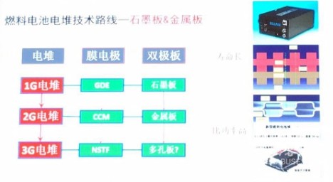 燃料电池里最关键的零部件是燃料电池电堆,这由两个东西组成,一个是膜电极、一个是金属极板,这两个东西拼在一起就是一个单电池,很多单电池串在一起成为一个电堆,发出所需要的功率。膜电极的发展方向已经确定下来的,最早是GDE型的,把催化剂涂在碳纸上面然后再把膜电极压好,第二代是CCM型的,把催化剂涂在膜上面然后压好,现在开发的纳米结构的超薄的电机、有序的电机,这个电机还在开发之中,这三代是顺着膜电极下来,这个大家已经有共识了,我们中国非常幸运,2004年的时候科技部当时支持我们做了CCM型膜电极,现在成为燃料电池车的标配,这个大家都形成共识,对双极板还有一点问题,这个最早大家都用石墨做双极板,因为要导电还要耐腐蚀,石墨材料比较好,现在为了提高功率密度就用金属板。