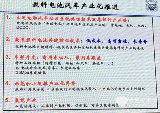 今后产业化的推广则要做这么几条:要利用我们现有在电动汽车行业里积攒的产业链上的优势。电池、电机、电控,基本上都跟我们现在的电动汽车是共性的东西,这是必须要利用的。同时要聚焦燃料电池的关键核心技术。中国有中国的特点,不一定要追求高大上,但对于系统的可靠性、稳定性、价格,我们应该遵循我们自己的路线,走出我们自己的路子。但这并不排除跟国际合作,国际合作我非常赞同,怎么样利用国际资源共同开发中国新能源汽车的市场,从车型投入上目前有这样的趋势,商用车切入、乘用车跟进,这点是有很多好处的。示范和小规模产业化并举,包括我们氢能产业怎么推动氢气的来源、氢气的制清,保证可再生能源,工业富产氢,包括弃风、弃电制氢这都是路子。总的来说,燃料电池产业化是有具体步骤的。