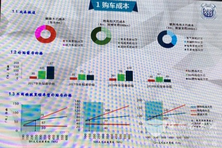 大家都在说推动燃料电池汽车商用化或者商用车的市场化,这个地方有几笔账,也利用这样的机会跟大家说一下。在购车成本方面,目前看我们有燃油汽车、纯电动汽车大巴、燃料电池汽车,购车成本是便宜还是贵?我们举一个例子,有8米、10米、12米大巴,我们根据目前的中国政策补贴情况做了一个计算。今年年初新的补贴政策要来,按照现有的补贴政策,我们燃料电池汽车和纯电动汽车大巴比还有一定劣势。但我们可以看出来,在补贴前我们肯定是劣势的,补贴以后我们基本上跟纯电动汽车大巴持平。考虑到2019年,对于纯电动大巴的这样一个退坡政策完全到位、完全是零的话,燃料电池仍然享受补贴,我们购成成本上会发生逆转。