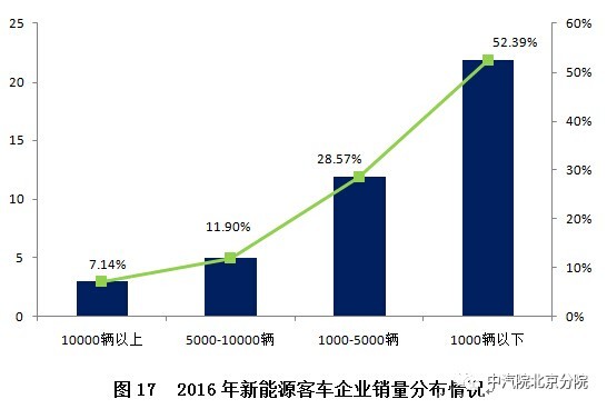 从图16可以看出,2016年,我国新能源客车共有42家企业实现销售,市场集中度较低,呈现“长尾状态”。各家企业市场份额基本可以分为三个梯队:市场份额大于5%:宇通、中通和比亚迪,南京金龙、金龙联合和北汽福田共5家企业。市场份额1-5%:厦门金旅、珠海广通、安凯客车等11家企业。市场份额小于1%:四川野马、上海申沃等25家企业。