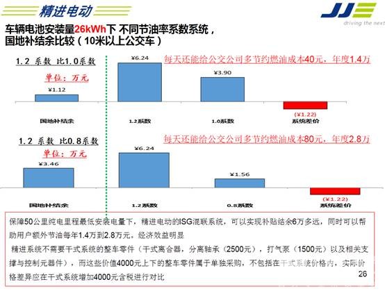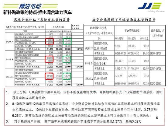 第二页,在插电式混合动力,我们做了一个简单的分析,这个分析来看,其实大家可能看得到一点的差异,这里就不多讲了。绿的跟红的,就是0.8跟1.2之间的区别,最终的结果是什么呢?10米以上车混合动力来看的话,不同节油率系数的补贴结余看,60%节油或1.2倍补贴系数的国地补结余大概能10万块钱,这10万块钱可以买一个最好的插电式混合动力系统,加上你的充电高压柜,加上你的电缆等等辅线,也就是你用国补不仅仅可以补充电池,也可以补掉高效率混合动力系统。而40%到45%或0.8系数你只能节余3万多块钱,你只能买到半个或者60%的非常便宜系统,整车企业要贴钱买系统,公交企业要贴钱,还要多花油钱。所以从整车制造成本来说,你用高效率的系统更核算。