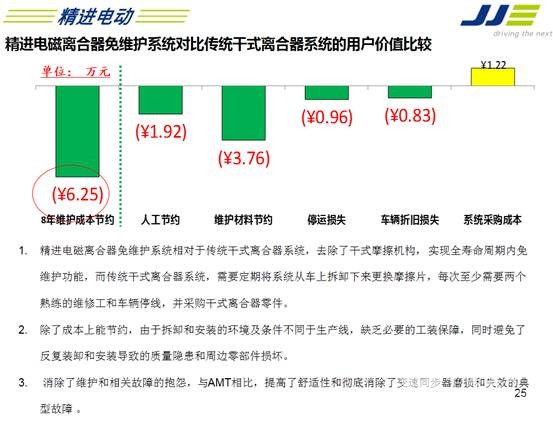 我们在不断的技术创新和产品升级,目前保持着国际上很多的技术,比如说功率密度的技术,国际上唯一可以实现全寿命免维护ISG混合动力双电机系统,我们可以向所有的客户承诺,在你这个车报废之前,你不需要对离合器系统做任何一次维护,刚刚我看了协会的调研报告,其中有一个报告就是说及5到6万公里换离合器,这是针对第一代,第一代干湿离合器,我们测算一下6千到8千块钱。以后选用精进电动的第二代免维护系统,您就不用花这个钱了,费这个神了。 我们自己今年开始大面积推出二挡自动变速器,大级差自动变速器(2.5速比和3.5速比),同时也可以实现我们换挡机构全部埋在箱子里面,外面没有任何执行机构,就是完全实现系统的IP67。