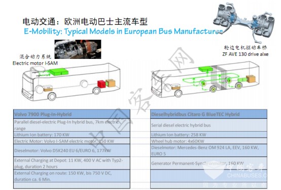 我经常讲一个故事,一辆12米的标准巴士,先进的电池电动巴士大约要配置三吨半的电池,每个乘客按50公斤体重算,你看一看这堆电池算相当于运载多少人在那里做无用功?这样的电池电动巴士是节能减排?或是浪费资源?各位领导你们想过这个问题没有?好,这是我们看到欧洲所谓传统的中央电机驱动路线,后边的是轮边电机驱动路线,这种技术路线的变革是不一样,这是欧洲主流车型。