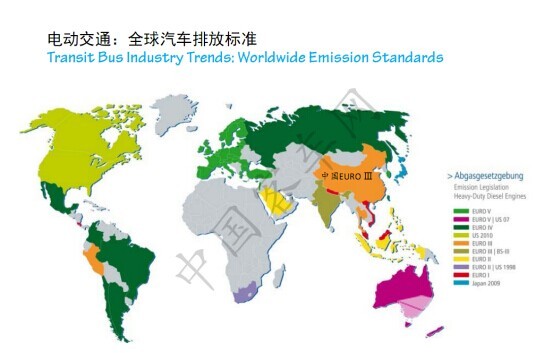 我们看这张表,客车领域里面哪些是新能源客车,主要的车型是电池电动巴士和混合动力巴士,燃料电池巴士。说句不好听的话,中国的新能源汽车在客车行业里就演变等同电池电动巴士,燃料电池巴士只有一到两款车型,你会看到清洁能源巴士和电池电动巴士是两个不同的概念。中国新能源客车的发展,大家把宝押到哪里了?几乎全都押在电池上了。前面很多专家都跟介绍了电池领域里的技术和标准发展,说这是中国的现状。这几张表是中国新能源客车目录的简要统计数据,我只是引用到这里。回归到为什么发展电动车的话题,目前的首要目标是为了减少排放,你会发现从美国到欧洲,全世界都在推行一个共同的标准就是限制汽车排放,所谓的国一、国二、国三、国四,以及欧一到欧六标准,都是在分阶段一步一步提升限制汽车排放标准,我们现在才达到国三国四的水平,还没有达到国五国六的阶段,你会想到国三转换到国四的时候,大家所承受的压力,一下子要从国三全部跳跃到电动化,比欧六标准更高的标准,真的是跳跃。