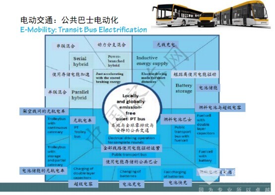 讲到电动车,很多人都把电动化的解决方案看作很单化,而欧洲人却把他看得很复杂化,他们罗列了这么一个表,这些要素都是结合公共交通行业的特征,你可以看得到的,在能量存储方面,除了有所谓的存储电池以外还,有所谓的超级电容,好在中国也有几家公司在做超级电容;在能源供应方面,有很多方式,电驱动除传统的电动轴以外,还有轮边驱动、还有轮毂驱动,这些技术路线在中国好像只有一种路线可以走,国家政策中所谓的三纵三横电动汽车技术路线规定了发展,我们发现不同的组合可能是产生未来有竞争力的产品。这是我们从车辆基础设施能源移动性的服务,整个产业当中做好,我们说电动车才是真正受欢迎有社会贡献的,光是车没有运用得好,还是事倍功半。