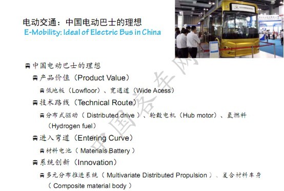 电动巴士的理想中,我们作为公共交通行业的专业人士,什么样的电动巴士最好?首先要有价值。什么叫做价值?在公共交通行业中,我们说最基本的价值就是为大众提供运输服务。美国在90年代颁布了残疾人法案,欧洲在1993年把低地板作为标准公共巴士的基本要求,现在公共巴士做了电动车有几个是滴滴版的。这是电动车轻轻松松可以实现滴滴版,但是没有利用这个机会,提供这么好的产品。还有一个电动车,公共巴士需要滴滴版宽通道,我们把发动机换掉,换了一大堆电池还是传统的那种驱动系统,既然是电机为什么不可以把电机放到那边上去?这不符合这个技术特征。这是我想的第二点。第三个方面,我们国家是想利用这个发展所谓的电动车来超越,现在可以肯定地说弯道没有超过去,这是我想到的理想的问题。