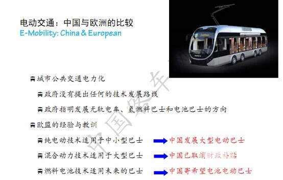 简单对比,欧洲跟中国其实都在发展电动车,但有一点微妙的区域。这个最早的电动车是从12米大车开始,欧洲则是从小型车开始做,现在才扩展做到大型车,这是第一个不一样的地方;欧洲政府的补贴几乎都是做一点示范性的样子,没有像中国政府这样大量补贴,这是又一个方面的不同;欧洲人认为混合动力对社会的贡献是最直接的,也就是说没有政府的补贴已经可以商业化,混合动力带来的能源的节约,这种成本上的节约可以弥补这种技术更新的成本,所以说混合动力在欧洲是受欢迎的,他们认为未来真正的电动巴士发展方向应该是在氢燃料上,跟我们国家押宝押在做各种各样的材料电池上,这一点的认知是大不一样的,现在我也不能说欧洲的判断就是正确的,至少十年前美国人也寄希望氢燃料的商业化,日本人,欧洲人他们都曾经看好过氢燃料,而我们目前只有一个研究框架。
