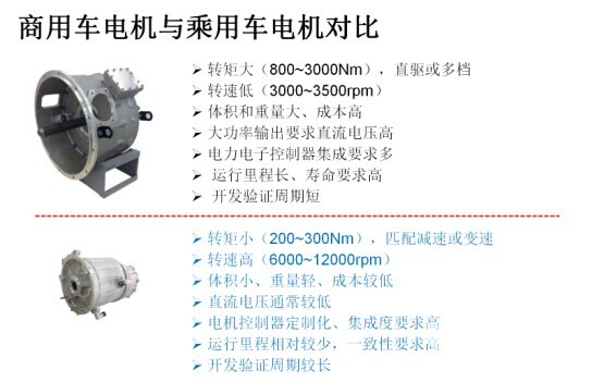 第二个对电机来讲的话,一般说这个电机多少千瓦,但实际上电机的体积和重量取决于扭矩,电机的转矩和体积是成正比。因为客车电机转速低,转矩大,所以重量比较高,对应的成本就比较高。