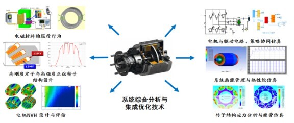 从电机本体技术看,分了这样几个方面:首先是电机设计技术。因为汽车应用不光是要考虑功率、转矩、效率,还要考虑发热、振动以及和电机控制的匹配,在这些约束下进行电机设计的时候就不单单是电磁设计,要考虑多个领域。我们提出的多领域集成、多层面优化和多端口匹配设计,多领域集成就是考虑机、电、热、磁等不同领域,多层面优化是从概念设计、场路耦合仿真到系统集成仿真的不同角度进行评估,多端口匹配是指机械端口、电端口以及热端口的匹配。