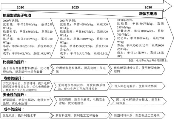 在中国制造2025里面也提到了动力电池能量密度的相关目标要求,2020年电池的能量密度达到300瓦时每公斤,2025年要达到400瓦时每公斤,2030年要达到500瓦时每公斤,依据中国制造2025的相关内容,制定了节能有新能源汽车的7+1技术发展路线图,其中的1就是总的技术发展路线图,7是7个分路线图,电池作为其中一个非常重要的分路线图。这里面从两个方面提的目标,一个是纯电动汽车用的能量型电池,一个插电式混合动力汽车用的能量功率兼顾型电池,大家要着重看一下在2020年提的目标要求,我觉得对电池企业而言挑战性是非常大的。所提的要求不是指标,是目标,是电池企业努力的方向。